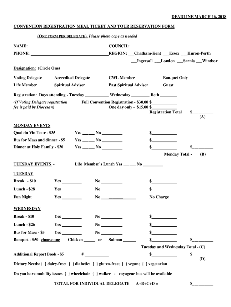 DEADLINE MARCH 16, 2018, CONVENTION REGISTRATION MEAL TICKET AND TOUR RESERVATION FORM (ONE FORM PER DELEGATE) Please photo copy as needed NAME:COUNCIL: PHONE:REGION: ChathamKent Essex Huron Perth