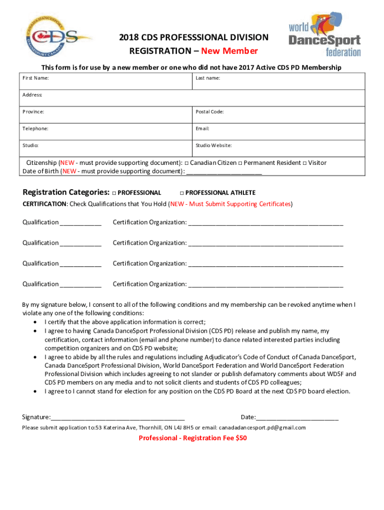 2018 CDS PROFESSIONAL DIVISION REGISTRATION New Member This form is for use by a new member or one who did not have 2017 Active CDS PD Membership First Name:Last name:Address: Province:Postal Code:Telephone:Email:Studio:Studio
