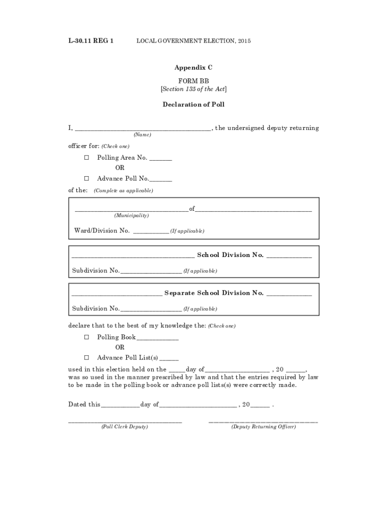 L30.11 REG 1LOCAL GOVERNMENT ELECTION, 2015Appendix C FORM BB Section 135 of the Act Declaration of Poll I, the undersigned deputy returning (Name)officer for: G(Check one)Polling Area No. ORG of