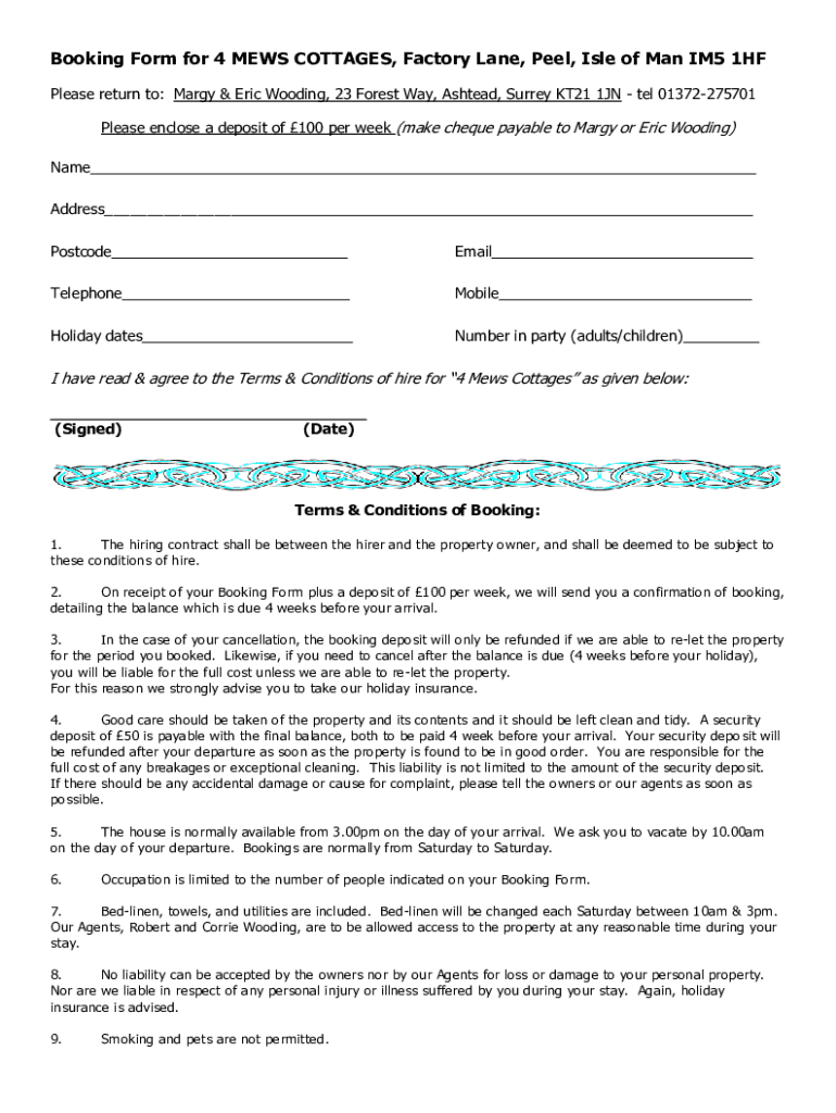 Booking Form for 4 MEWS COTTAGES, Factory Lane, Peel, Isle of Man IM5 1HF Please return to: Mary & Eric Wooding, 23 Forest Way, Ahead, Surrey KT21 1JN tel 01372275701 Please enclose a deposit of 100
