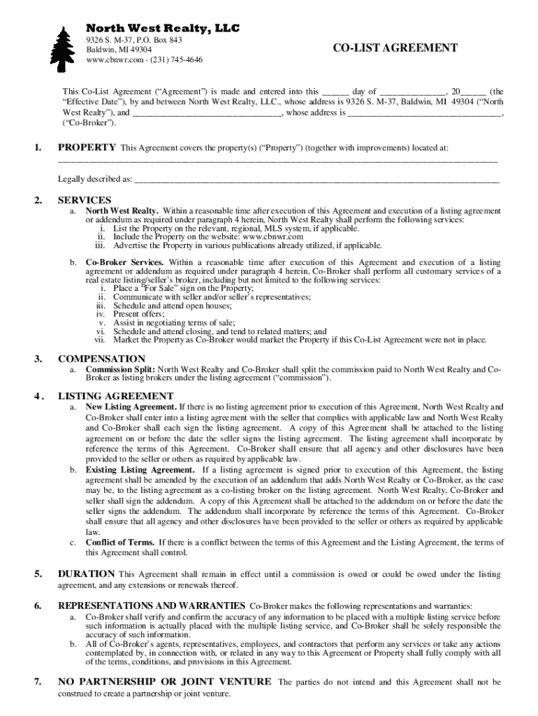 Get the free North West Realty, LLC CO-LIST AGREEMENT