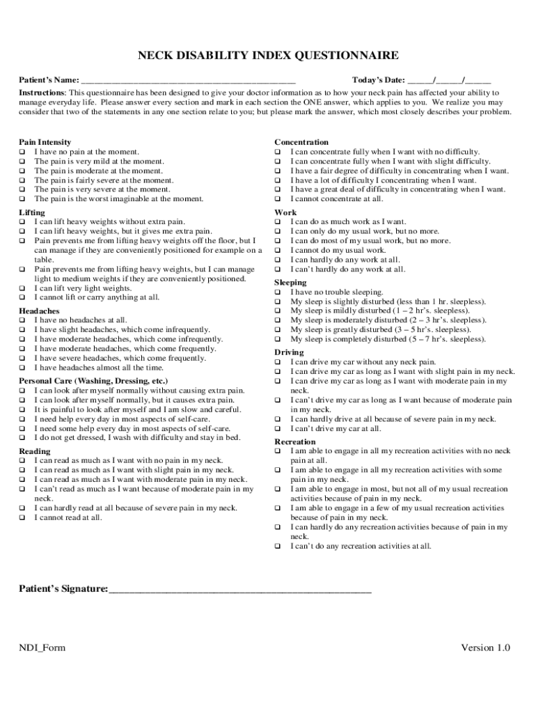 NECK DISABILITY INDEX QUESTIONNAIRE Patients Name: Today's Date: / / Instructions: This questionnaire has been designed to give your doctor information as to how your neck pain has affected your ability