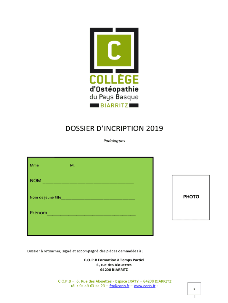 DOSSIER DESCRIPTION 2019PodologuesMmeM.NOT de June file Photoperiod Dossier returner, sign ET accompany DES pics demands :C.O.P.B Formation Temps Partiel6, rue DES Alouettes64200 BIARRITZ. O.P.B 6,