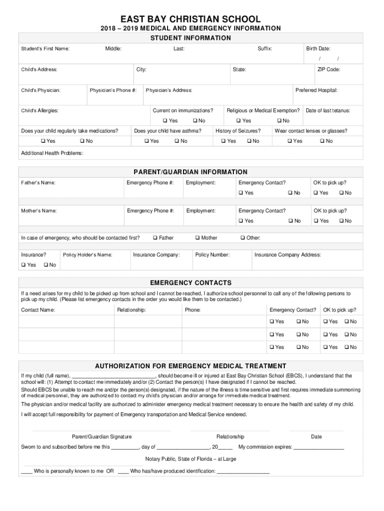 EAST BAY CHRISTIAN SCHOOL 2018 2019 MEDICAL AND EMERGENCY INFORMATION STUDENT INFORMATION Students First Name:Middle:Last:Suffix:Birth Date: /Child's Address:City:Child's Physician:Physicians Phone