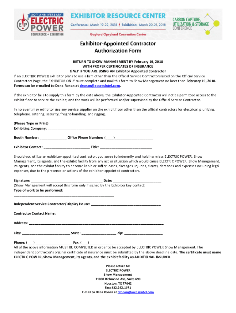 Get the free Exhibitor-Appointed Contractor Authorization Form RETURN ...