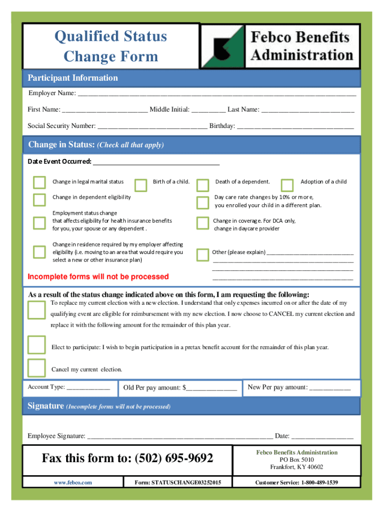 Qualified Status Change Form Participant Information Employer Name: First Name: Middle Initial: Last Name: Social Security Number: Birthday: Change in Status: (Check all that apply) Date Event Occurred: