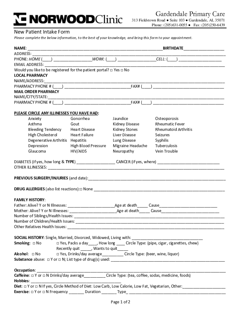 To fill out the forms required by Norwood Clinic-Gardendale Primary Care, patients should gather their personal identification, insurance details, and medical history, then complete the forms accurately before their appointment.