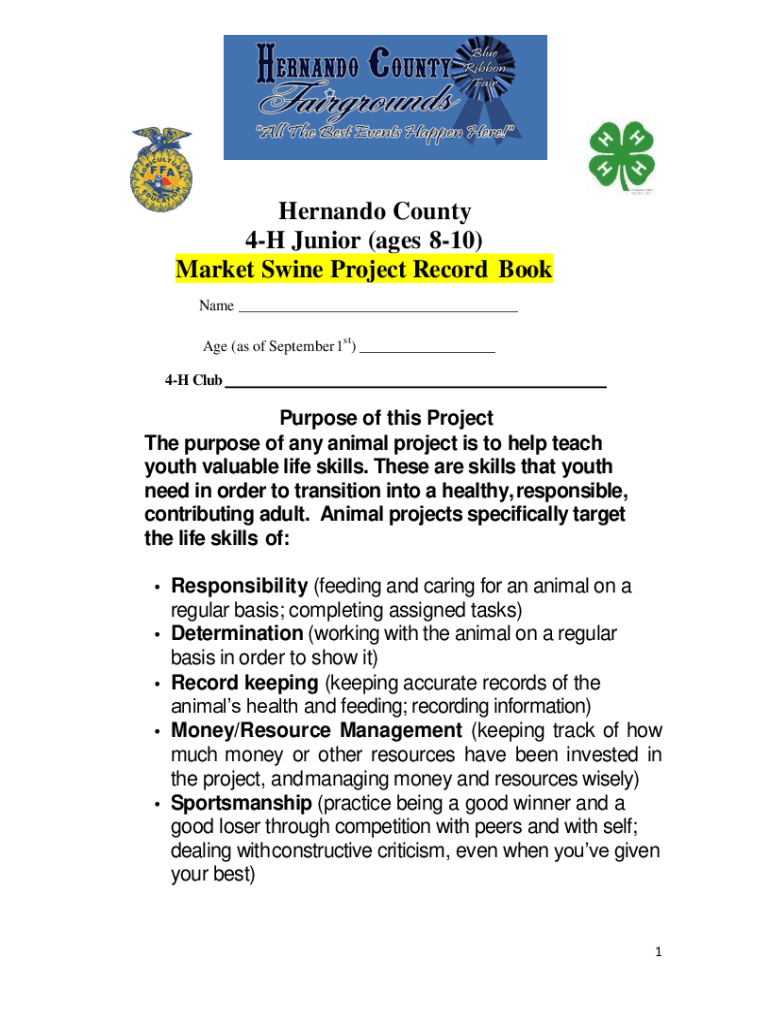 Hernando County 4H Junior (ages 810) Market Swine Project Record Book Name Age (as of September 1st) 4H ClubPurpose of this Project The purpose of any animal project is to help teach youth valuable