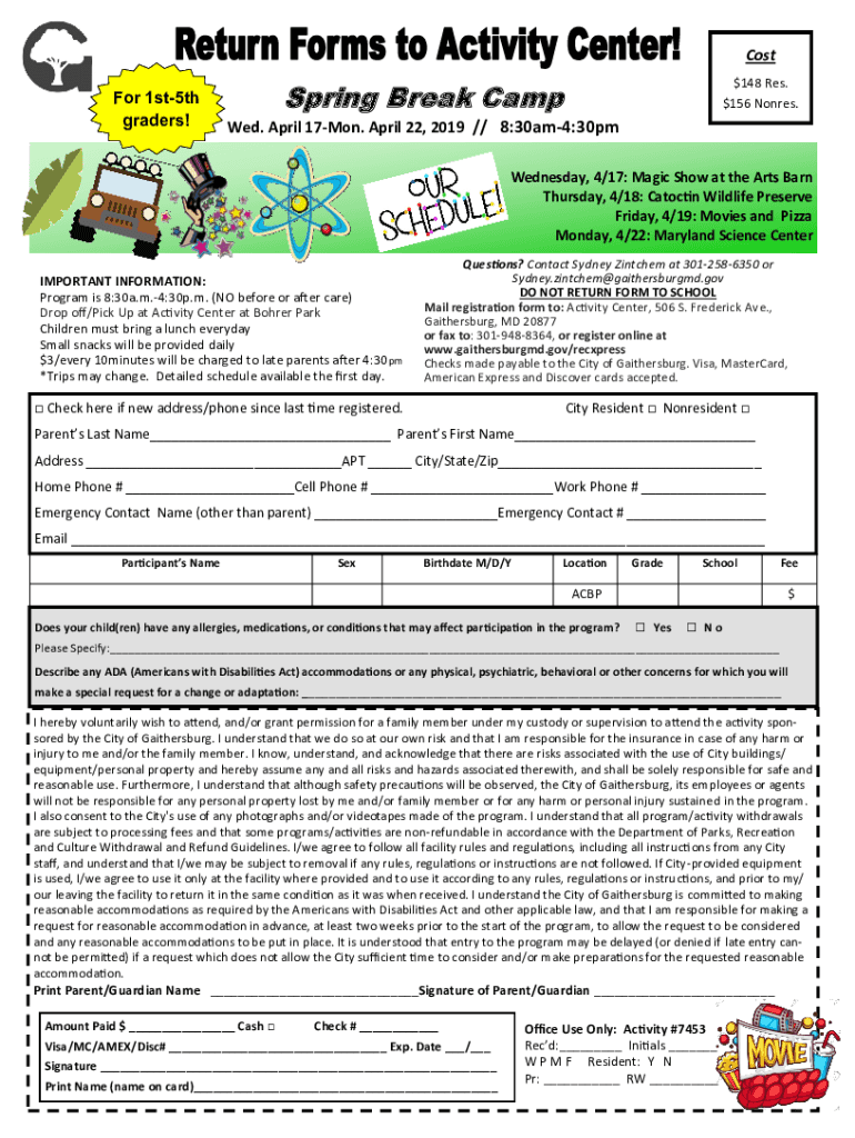 Costarring Break Camphor 1st5th graders!$148 Res. $156 Nonres. Wed. April 17Mon. April 22, 2019 // 8:30am4:30pm City of Gaithersburg 3012586350www.Gaithersburg.gov Wednesday, 4/17: Magic Show at the