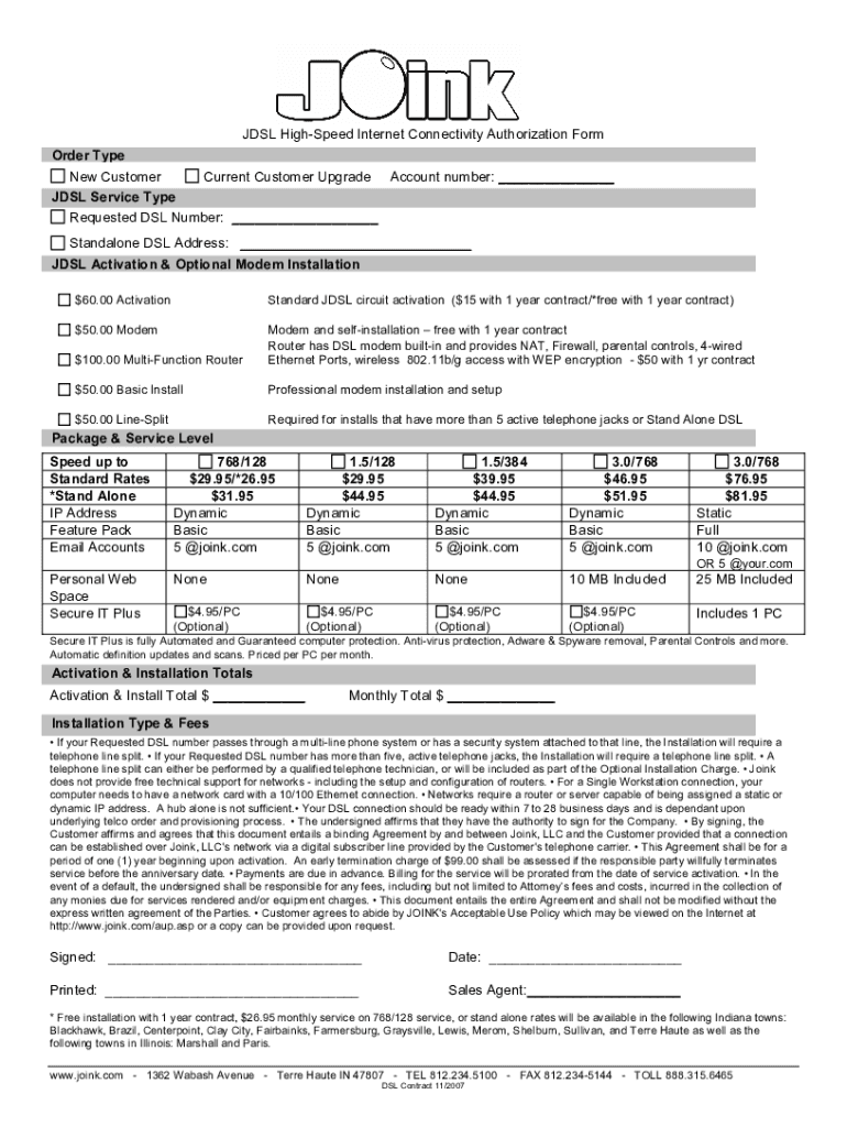 ADSL High Speed Internet Connectivity Authorization Form Order Type New Customer Current Customer Upgrade Account number: ADSL Service Type Requested DSL Number: Standalone DSL Address: ADSL Activation