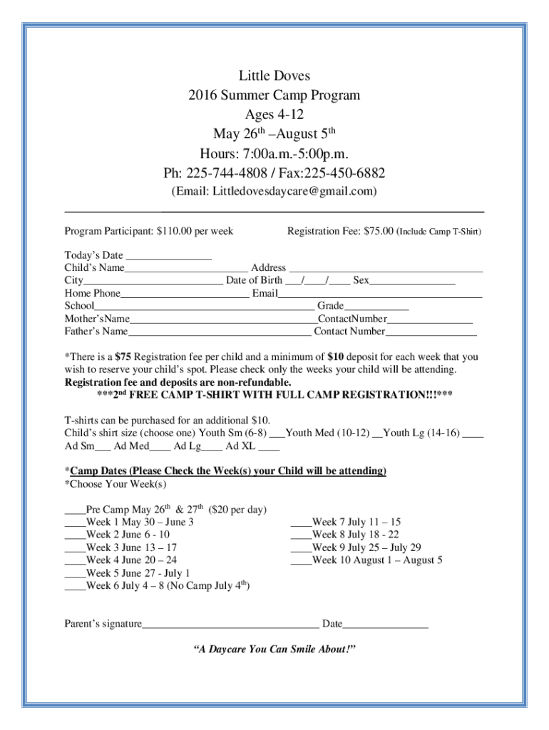 Little Doves 2016 Summer Camp Program Ages 412 May 26th August 5th Hours: 7:00a.m.5:00p.m. pH: 2257444808 / Fax:2254506882 (Email: Littledovesdaycare gmail.com) Program Participant: $110.00 per preregistration