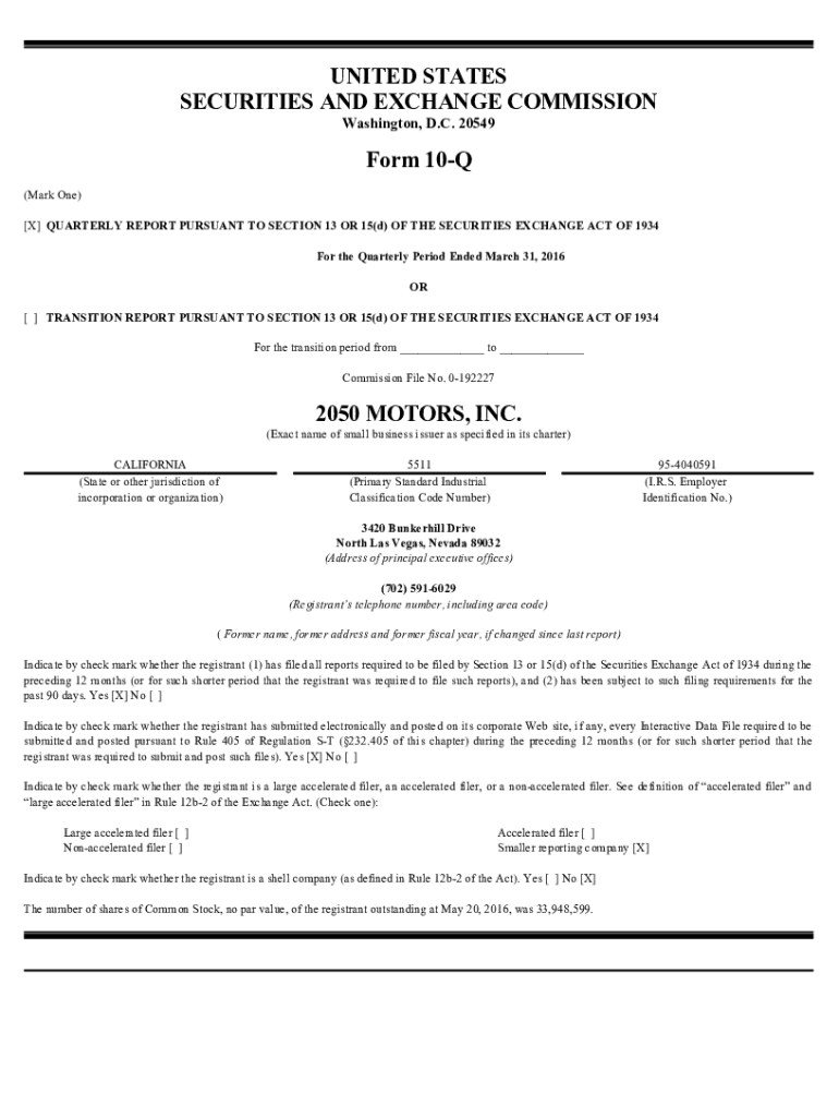 Get the free 2050 MOTORS, INC.. FORM 10-Q (Quarterly Report) Filed 05/23/16 for the Period Ending...