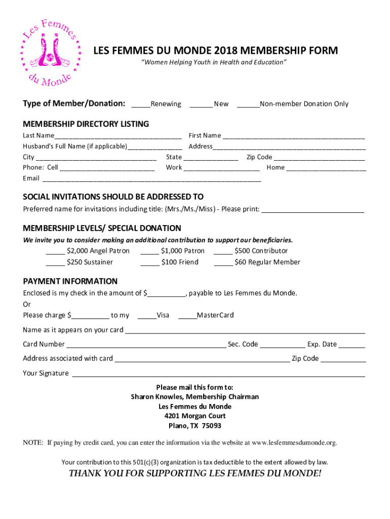 LES FEM MES DU MODE 2018 MEMBERSHIP FORM Women Helping Youth in Health and EducationType of Member/Donation: Renewing New Nonmember Donation Only MEMBERSHIP DIRECTORY LISTING Last Name First Name