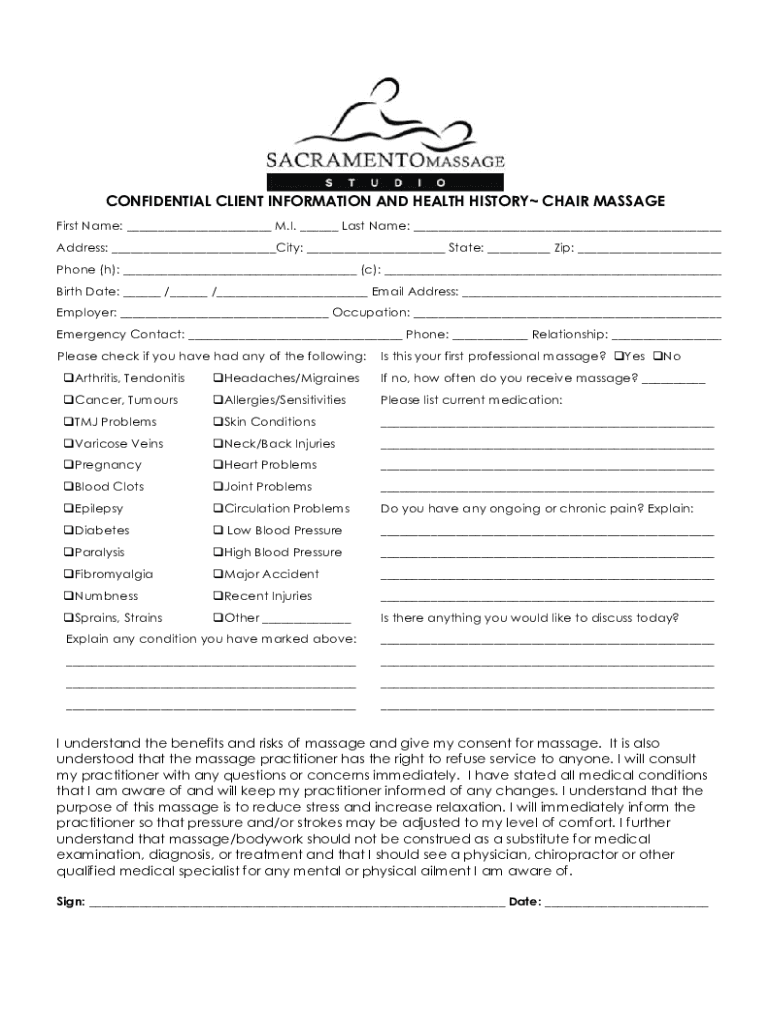 CONFIDENTIAL CLIENT INFORMATION AND HEALTH HISTORY CHAIR MASSAGE First Name: M.I. Last Name: Address: City: State: Zip: Phone (h): (c): Birth Date: / / Email Address: Employer: Occupation: Emergency