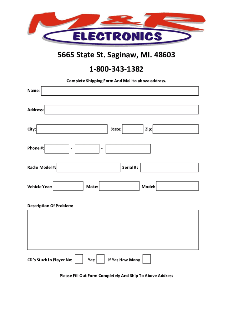Name:Address:City:Phone #:State:Zip:Radio Model #:Serial # :Vehicle Year:Make:Model:Description Of Problem:CDs