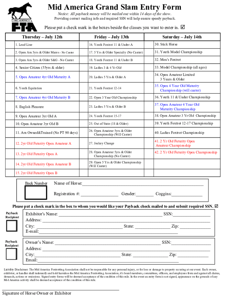 Mid-America Grand Slam Entry Form Notice: All payback money will be mailed out within 14 days of the show. Providing correct mailing info and required SSN will help ensure speedy payback. Please put