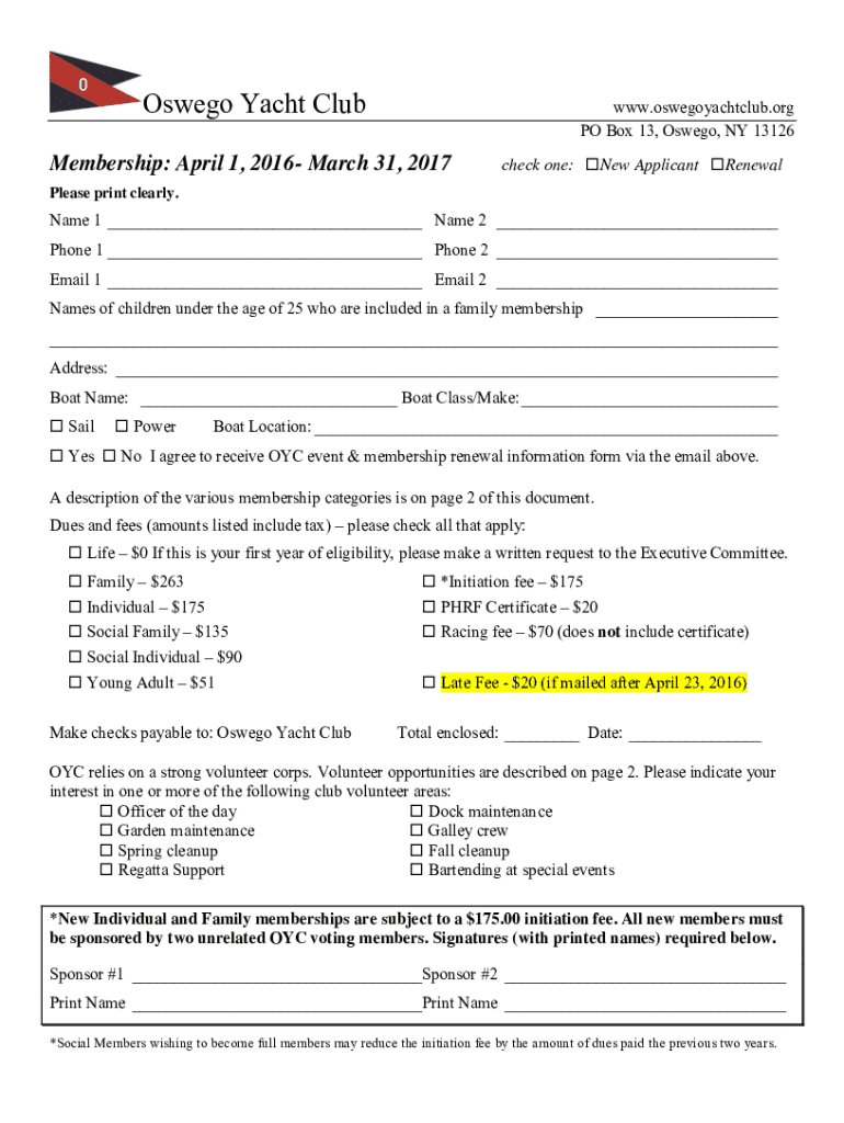 Oswego Yacht Club.oswegoyachtclub.org PO Box 13, Oswego, NY 13126Membership: April 1, 2016, March 31, 2017check one:New ApplicantRenewalPlease print clearly. Name 1 Name 2 Phone 1 Phone 2 Email 1