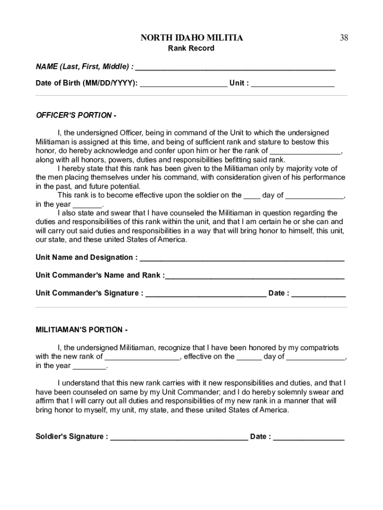 NORTH IDAHO MILITIA38Rank Record NAME (Last, First, Middle) : Date of Birth (MM/DD/YYY): Unit : OFFICER IS PORTION I, the undersigned Officer, being in command of the Unit to which the undersigned