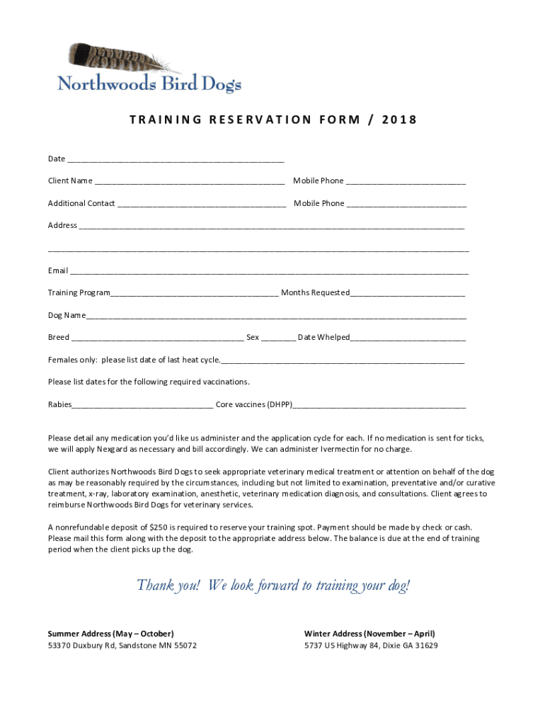 TRAINING RESERVATION FORM / 2018 Date Client Name Mobile Phone Additional Contact Mobile Phone Address Email Training Program Months Requested Dog Name Breed Sex Date Whelped Females only: please