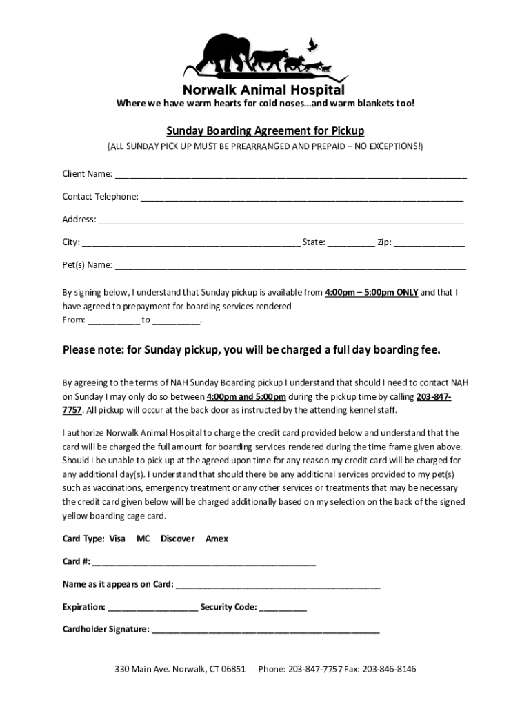 Where we have warm hearts for cold nose sand warm blankets too! Sunday Boarding Agreement for Pickup (ALL SUNDAY PICK UP MUST BE PREARRANGED AND PREPAID NO EXCEPTIONS!) Client Name: Contact Telephone: