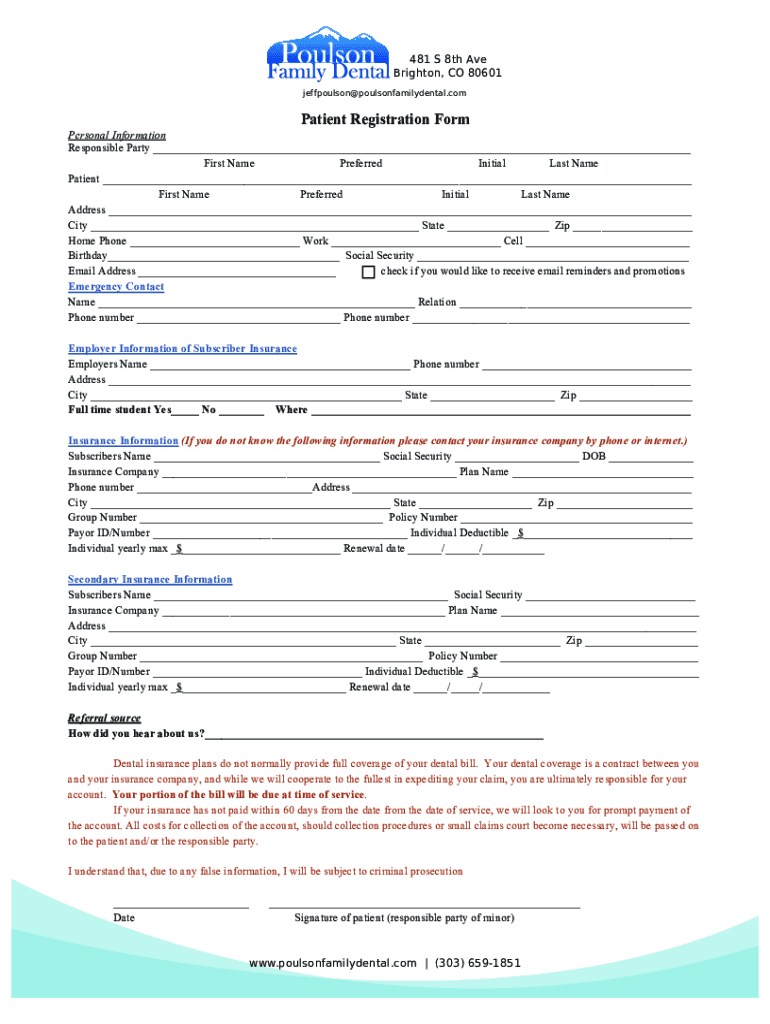 481 S 8th Ave Brighton, CO 80601 jeffpoulson poulsonfamilydental. Compartment Registration Form Personal Information Responsible Party First Name Preferred Initial Last Name Patient First Name Preferred