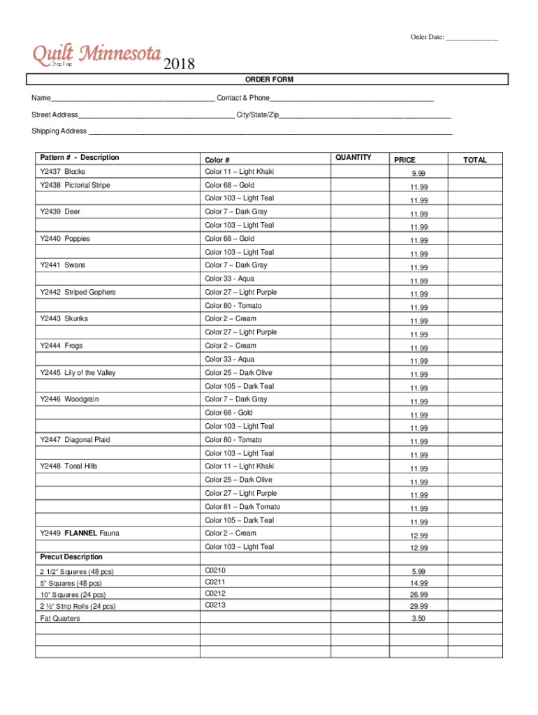 Order Date: 2018 ORDER FORM Name Contact & Phone Street Address City/State/Zip Shipping Address Pattern # DescriptionColor #Y2437 BlocksColor 11 Light Khaki9.99Y2438 Pictorial Tricolor 68 Gold11.99Color