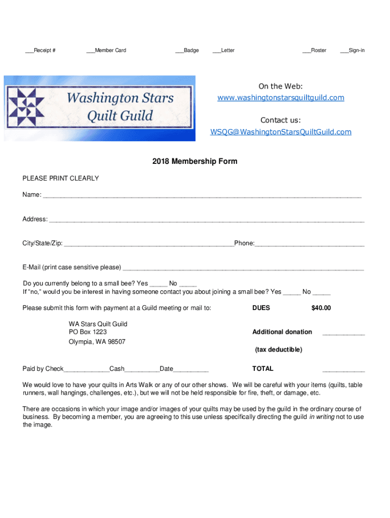 Receipt # Member Card Badge Letter Roster Signing the Web: www.washingtonstarsquiltguild.com Contact us: WING WashingtonStarsQuiltGuild.com2018 Membership Form PLEASE PRINT CLEARLY Name: Address: