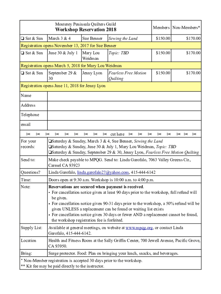 Monterey Peninsula Quilters GuildMembers Nonmembers×Workshop Reservation 2018 Sat & Sun March 3 & 4Sue BennerSewing the Land$$$$$$150.00170.00150.00170.00150.00170.00Registration opens November 13,