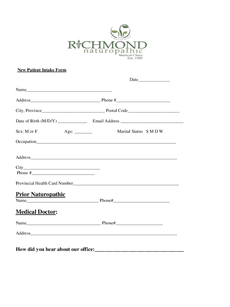 New Patient Intake Form Date Name Address Phone # City, Province Postal Code Date of Birth (M/D/Y) Sex: M or Email Address Age: Marital Status S M DW Occupation Address City Phone # Provincial Health