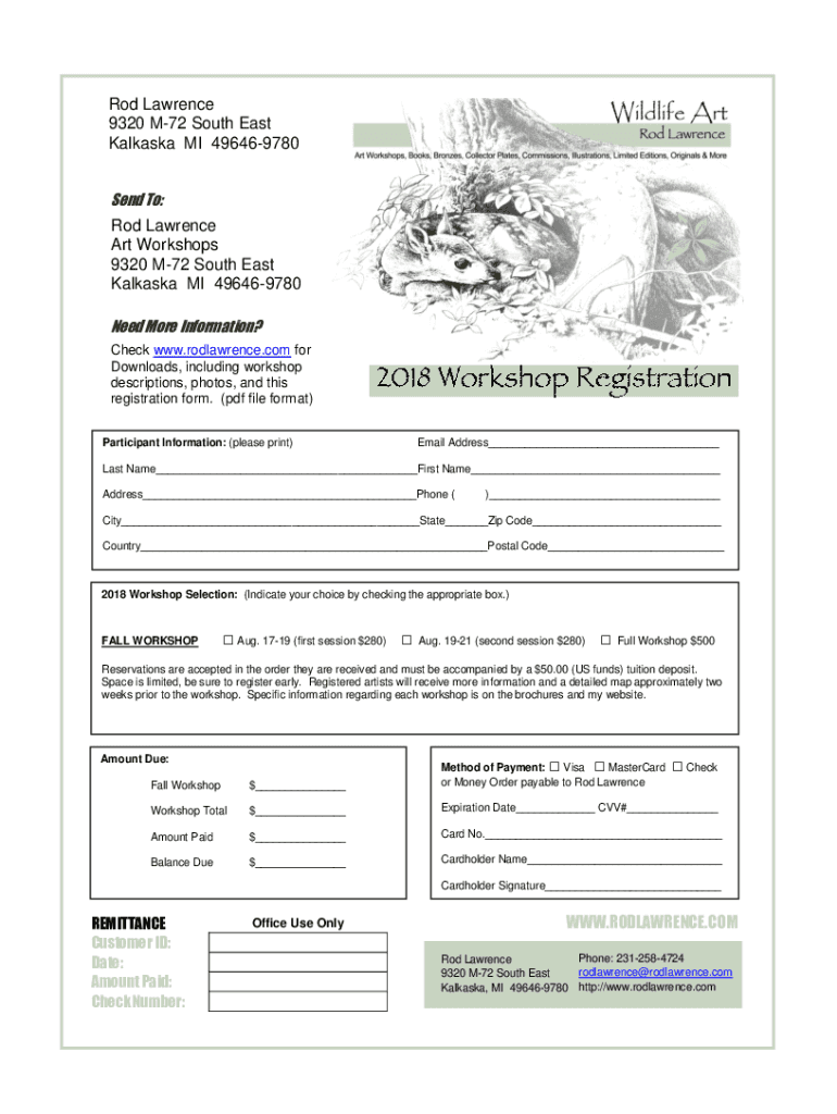 Rod Lawrence 9320 M72 South East Alaska MI 496469780 Send To:Rod Lawrence Art Workshops 9320 M72 South East Alaska MI 496469780 Need More Information? Check www.rodlawrence.com for Downloads, including