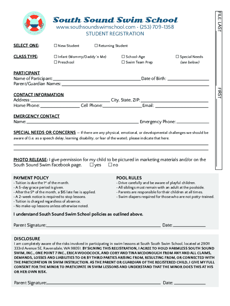 SwimSchoolSELECT ONE:South Sound Swim School www.southsoundswimschool.com (253) 7091358 STUDENT Registration New Students Returning StudentCLASS TYPE’m Infant (Mother/Father n Me’m Preschool Schooled