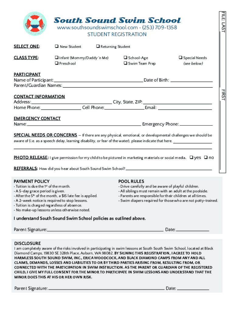 SwimSchoolSELECT ONE:FILE: Last Son of d South Sound Swim School www.southsoundswimschool.com (253) 7091358 STUDENT Registration New Students Returning StudentCLASS TYPE:q Infant (Mother/Father n