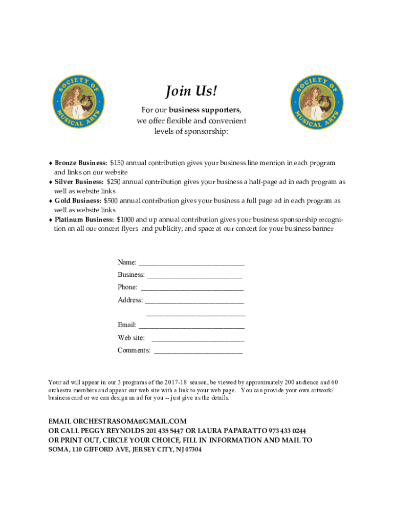 Join Us! For our business supporters, we offer flexible and convenient levels of sponsorship: Bronze Business: $150 annual contribution gives your business line mention in each program and links on