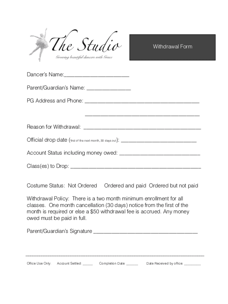 Withdrawal Romancers Name: Parent/Guardians Name: PG Address and Phone: Reason for Withdrawal: Official drop date (first of the next month, 30 days out): Account Status including money owed: Class(BS)