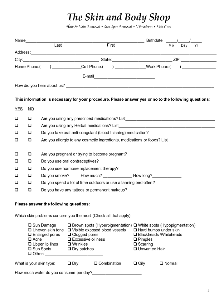 TheSkinandBodyShop Hair & Vein Removal Sun Spot Removal Vibrate Skin Carnage Birthdate / / Last First Mo Day Yr Address: City: State: ZIP: Home Phone:() Cell Phone:() Work Phone:() Email How did you