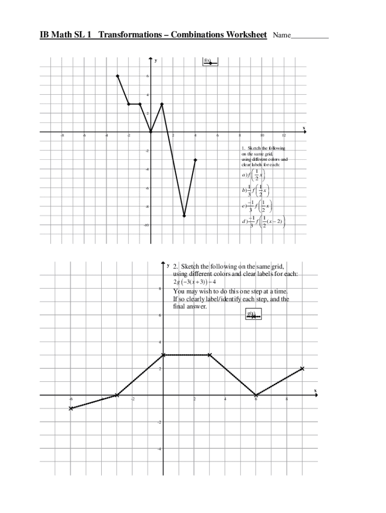 IB Math SL 1 Transformations Combinations Worksheet Name f(x)y642x 8642246810121. Sketch the following on the same grid, using different colors and clear labels for each:21 a) f × 2 1 1 b) f × 3