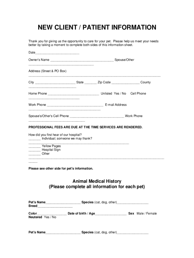 NEW CLIENT / PATIENT INFORMATION Thank you for giving us the opportunity to care for your pet. Please help us meet your needs better by taking a moment to complete both sides of this information sheet.