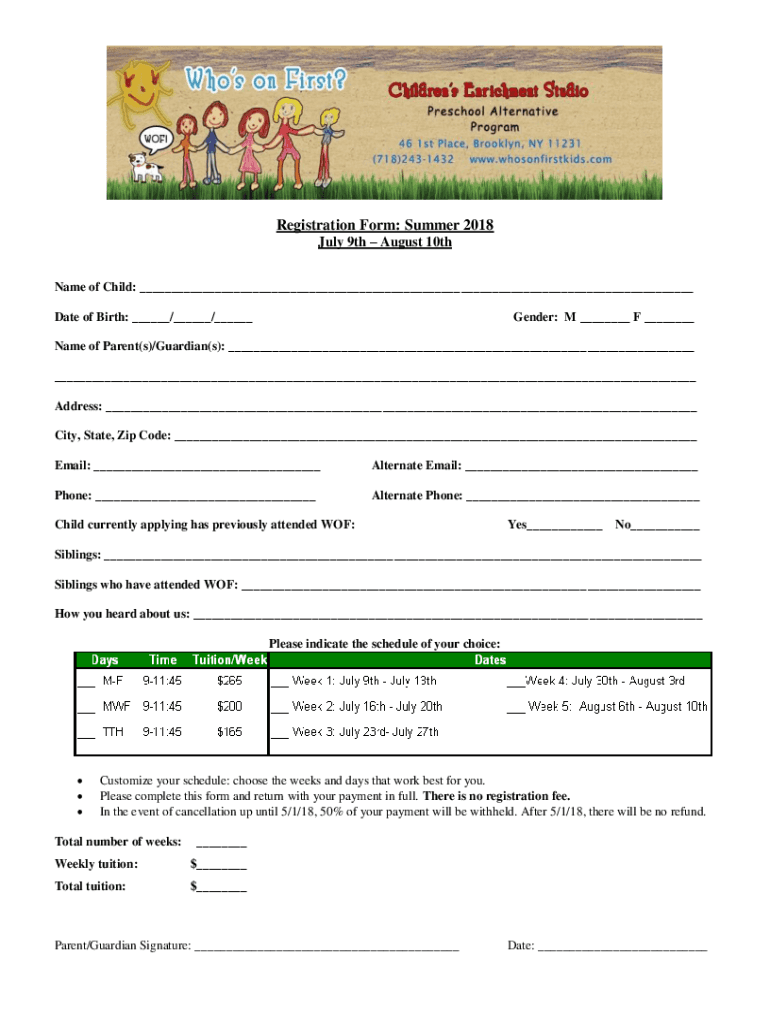 Registration Form: Summer 2018 July 9th August 10th Name of Child: Date of Birth: / / Gender: M F Name of Parent(s)/Guardian(s): Address: City, State, Zip Code: Email: Alternate Email: Phone: Alternate