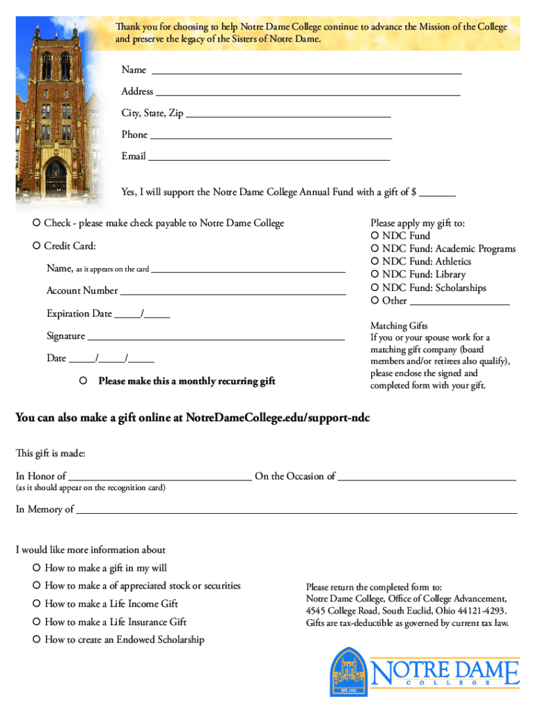 Thank you for choosing to help Notre Dame College continue to advance the Mission of the College and preserve the legacy of the Sisters of Notre Dame. Name Address City, State, Zip Phone Email Yes,
