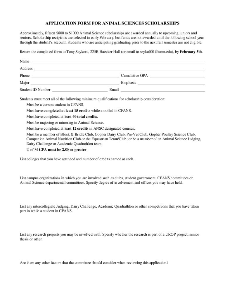APPLICATION FORM FOR ANIMAL SCIENCES SCHOLARSHIPS