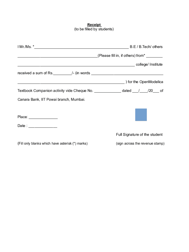 Receipt (to be filled by students)I Mr./Ms. × B. E / B. Tech/ others (Please fill in, if others) from* college/ Institute received a sum of Rs. / (in words) for the OpenModelica Textbook Companion