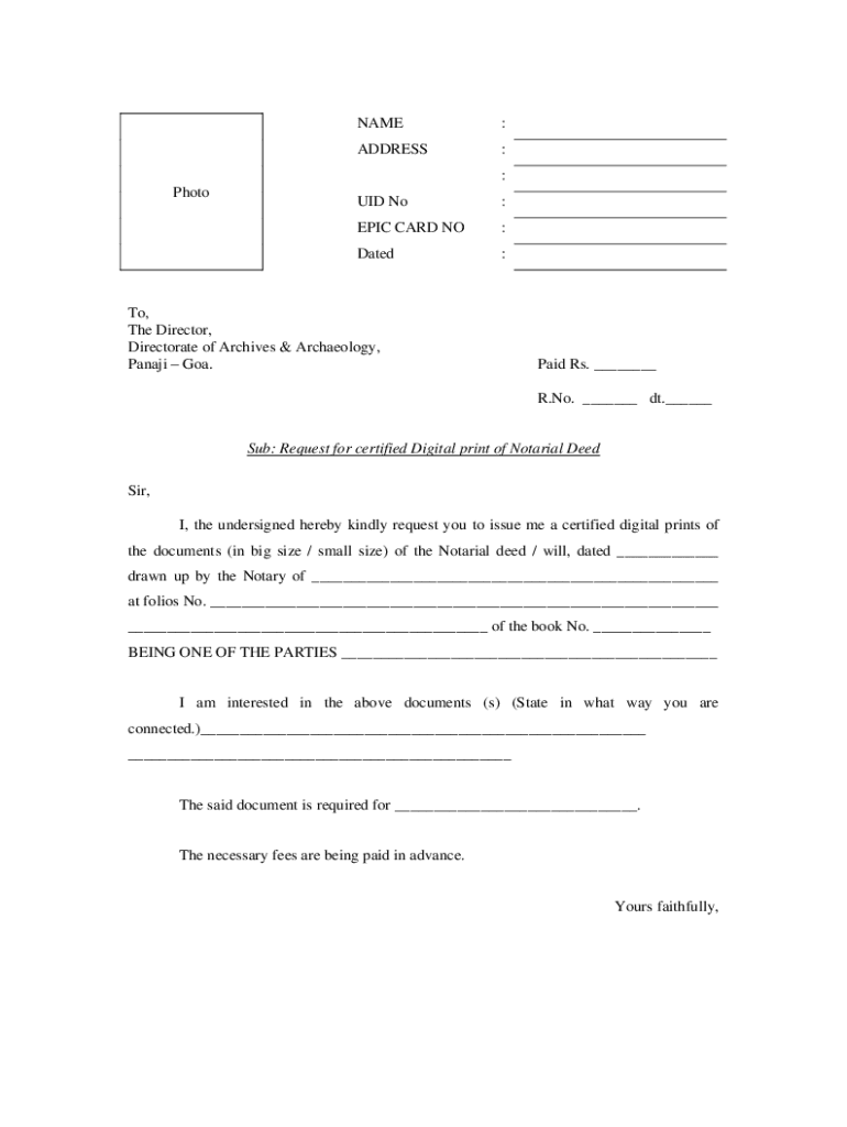 NAME:ADDRESS: :Photoed No:EPIC CARD NO:Dated:To, The Director, Directorate of Archives & Archaeology, Panama Goa. Paid Rs. R. No. DT. Sub: Request for certified Digital print of Notarial Deed Sir,