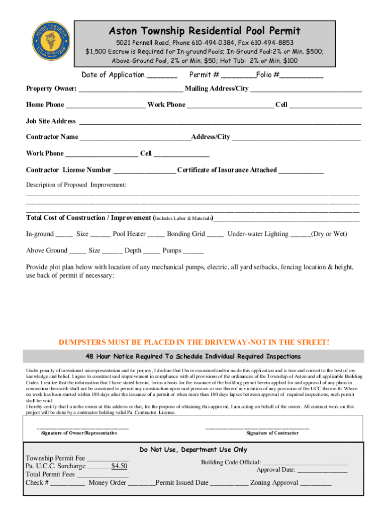 Aston Township Residential Pool Permit 5021 Penn ell Road, Phone 6104940384, Fax $61049488531,500 Escrow is Required for In ground Pools; In-ground Pool:2% or Min. $500; Foreground Pool, 2% or Min.