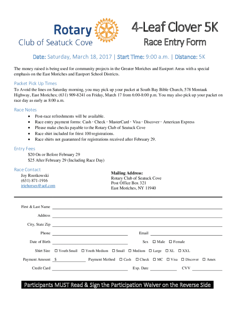 4Leaf Clover 5K Race Entry Format: Saturday, March 18, 2017, Start Time: 9:00 a.m. Distance: 5K The money raised is being used for community projects in the Greater Mo riches and East port Areas with