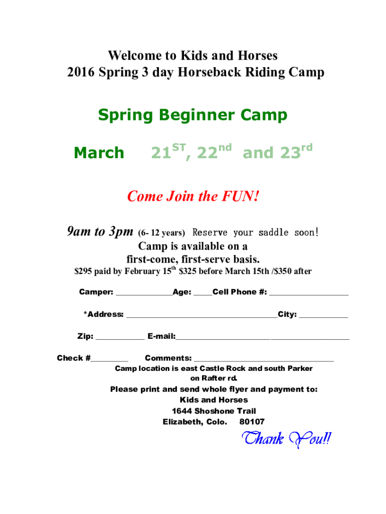 Welcome to Kids and Horses 2016 Spring 3 day Horseback Riding Camping Beginner Camp 21ST, 22nd and 23rdMarchCome Join the FUN! 9am to 3pm(6 12 years) Reserve your saddle soon! Camp is available on