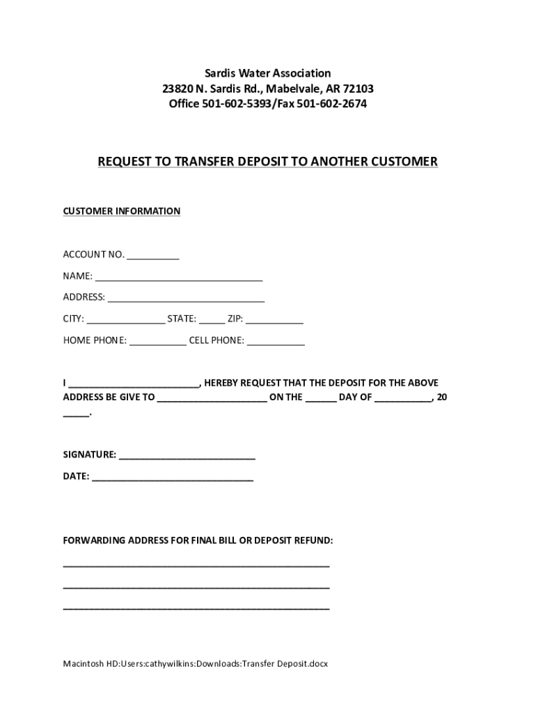 Saris Water Association23820 N. Saris Rd., Mabel vale, AR 72103Office 5016025393/Fax 5016022674REQUEST TO TRANSFER DEPOSIT TO ANOTHER CUSTOMERCUSTOMER INFORMATIONACCOUNT NO. NAME: ADDRESS: CITY: STATE: