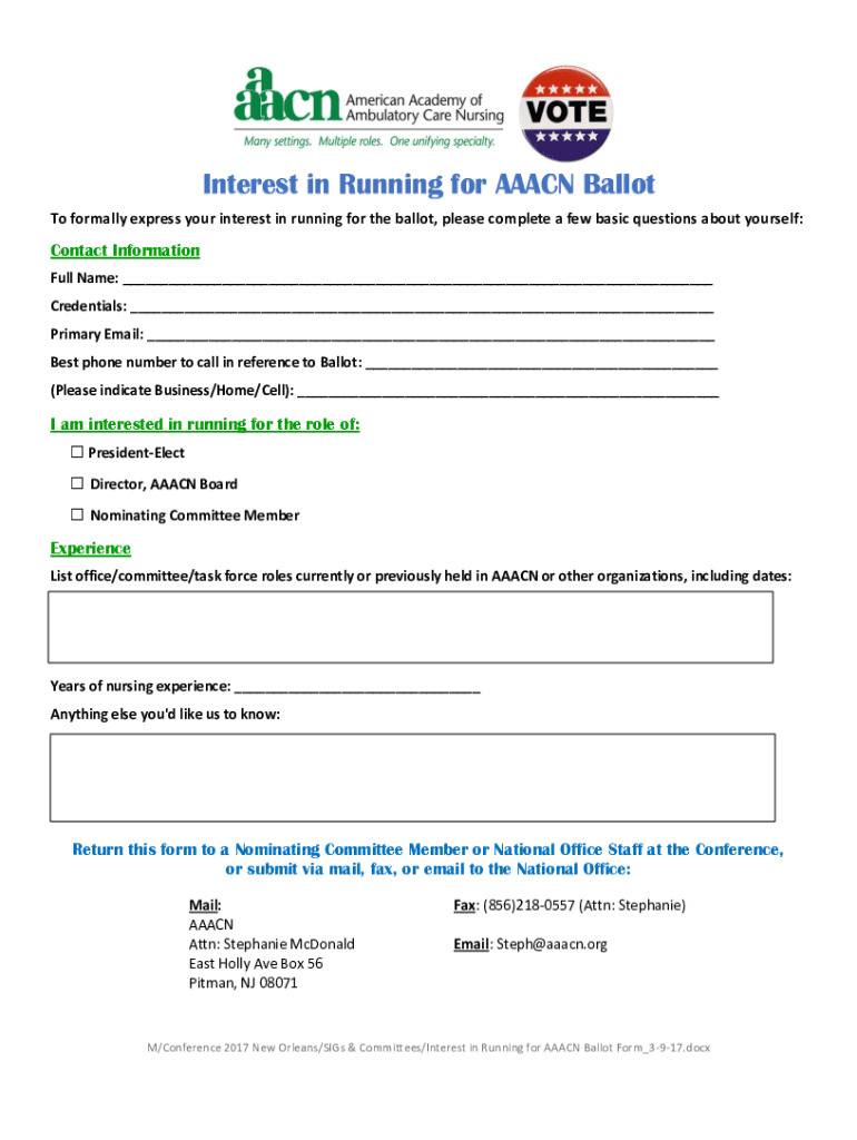 Interest in Running for AA ACN Ballot To formally express your interest in running for the ballot, please complete a few basic questions about yourself:Contact Information Full Name: Credentials:
