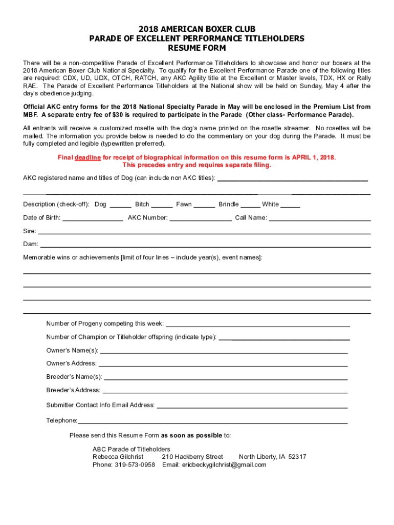 There will be a noncompetitive Parade of Excellent Performance Titleholders to showcase and honor our boxers at the