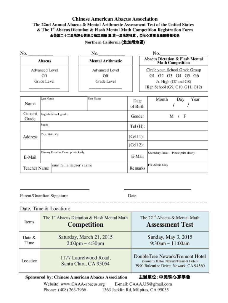 Chinese American Abacus Association The 22nd Annual Abacus & Mental Arithmetic Assessment Test of the United States & The 1st Abacus Dictation & Flash Mental Math Competition Registration Form Northern