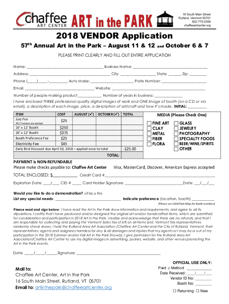 2018 VENDOR Application 57th Annual Art in the Park August 11 & 12andOctober 6 & 7PLEASE PRINT CLEARLY AND FILL OUT ENTIRE APPLICATION Name: Business Name: Address: City: State: Zip: Phone () Auto